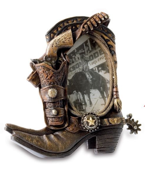 Apportez une touche du Far West à votre intérieur avec ce cadre photo original en forme de botte de cowboy, délicatement décoré d’un revolver et de motifs western authentiques.