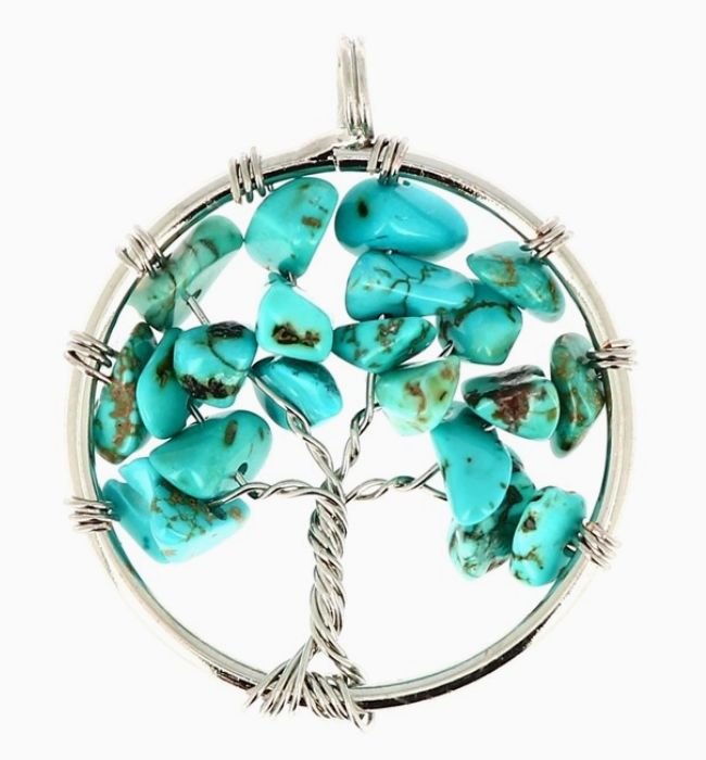 Sublimez votre style avec ce pendentif arbre de vie en turquoise authentique, réalisé avec un fil métallique argenté raffiné et orné de véritables pierres de turquoise bleue.