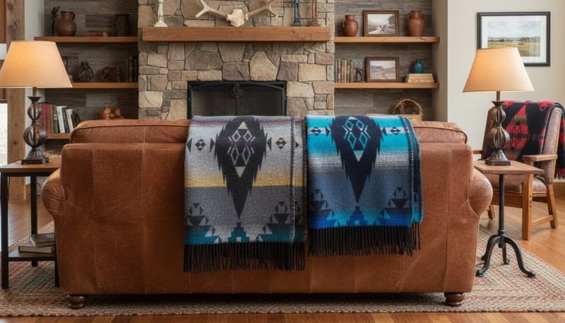 Son design jacquard ethnique multicolore, doublé recto-verso en négatif-positif, en fait un accessoire à la fois esthétique et polyvalent. Que vous l’utilisiez en décoration sur un canapé, comme couverture chaude pour vos voyages, ou pour créer une ambiance chaleureuse façon Ouest américain, il s’adapte à toutes les situations.