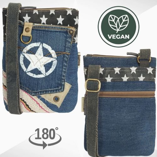 Choix 2 : taille de 25x20x2 cm et une bandoulière réglable de 84-145 cm, vegan est fabriqué à 100% en coton, jeans recyclés et toile, et pèse 220 g avec un volume d’environ 1 litre.