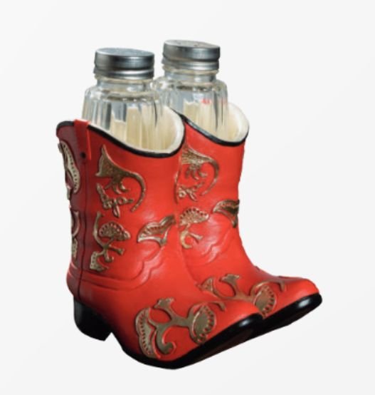 Ajoutez une touche d’originalité et de charme western à votre table avec ce set salière et poivrière bottes de cow-boy ! Ce duo incontournable se compose de deux pots en céramique, élégamment présentés dans un porte-épices en forme de bottes de cow-boy rouges ornées de motifs dorés raffinés. Idéal pour dynamiser votre cuisine ou surprendre vos invités, ce set est parfait en cadeau pour les passionnés de décoration ou les amoureux du style western. Dimensions approximatives : 13x10x10cm.